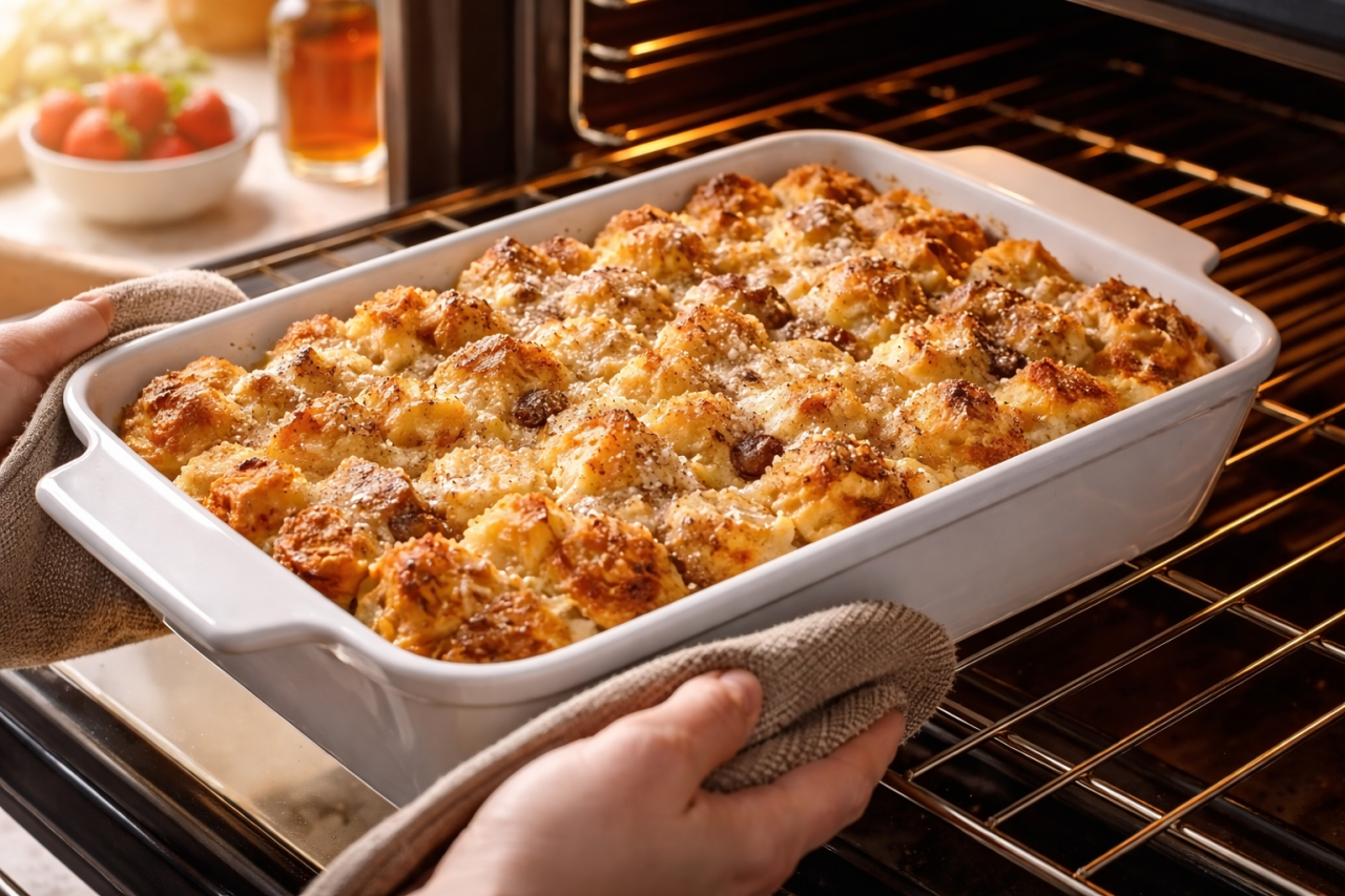 Это тот самый вариант, когда утром хочется “как в кафе”, но без стояния у плиты. Вечером за 10 минут собираешь форму, ночью хлеб пропитывается нежной яичной заливкой, утром остаётся только поставить в духовку. Сверху получается ароматная корочка, внутри мягко, сливочно, режется порциями, удобно для семьи и для гостей.