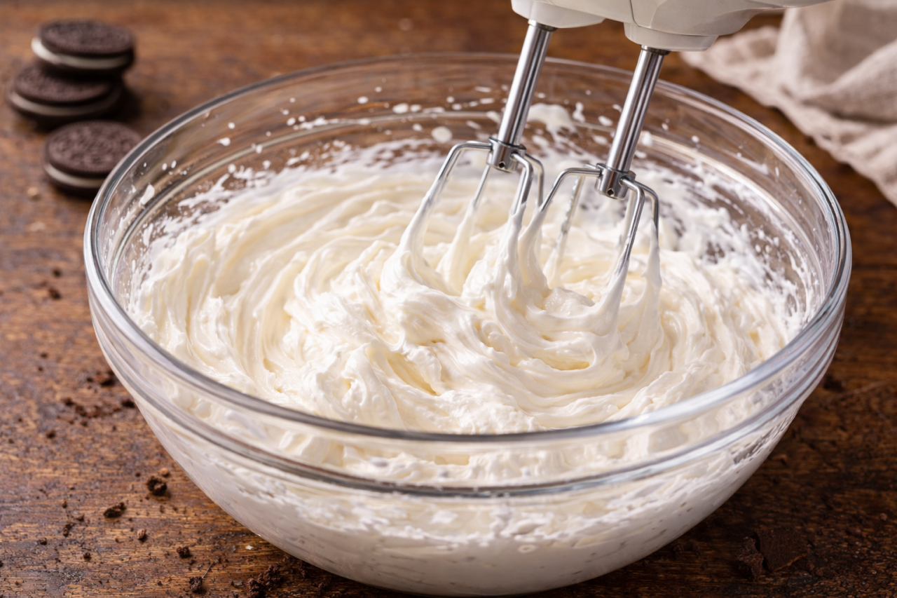 В другой миске взбей сливки до мягких пиков, чтобы масса держала форму, но не была “перевзбитой”.