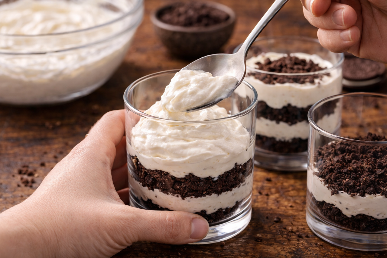 Если хочется десерт без духовки и без долгих приготовлений, этот вариант закрывает задачу почти мгновенно. «Орео» в стакане собирается слоями из шоколадной крошки и нежного сливочного крема, выглядит аккуратно порционно и всегда получается, даже если готовить на бегу. Можно есть сразу, а можно дать ему постоять в холодильнике, тогда слои станут плотнее и вкус соберется.
