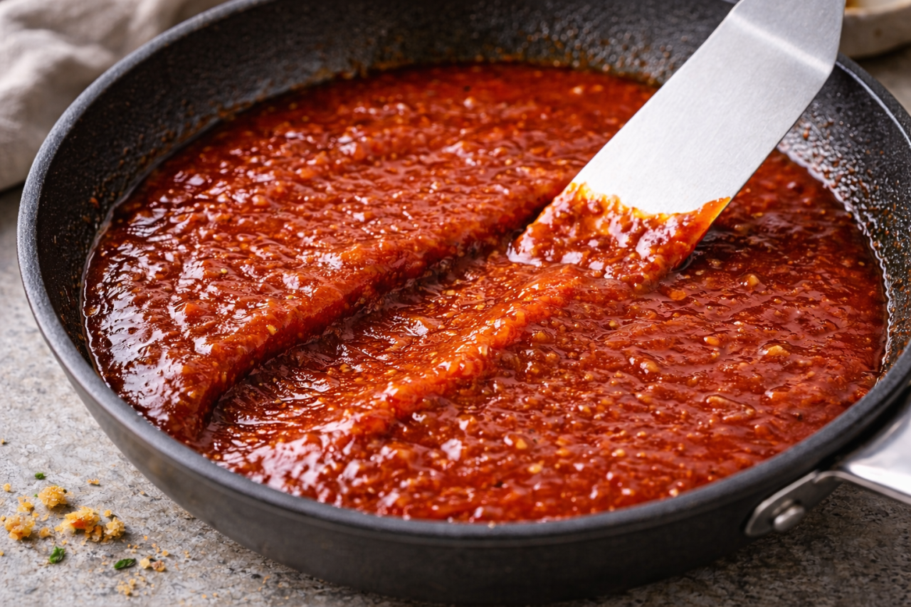 Вмешайте томатную пасту, обжарьте 60–90 секунд, цвет должен стать темнее, аромат “томатный”, без сырой кислоты.