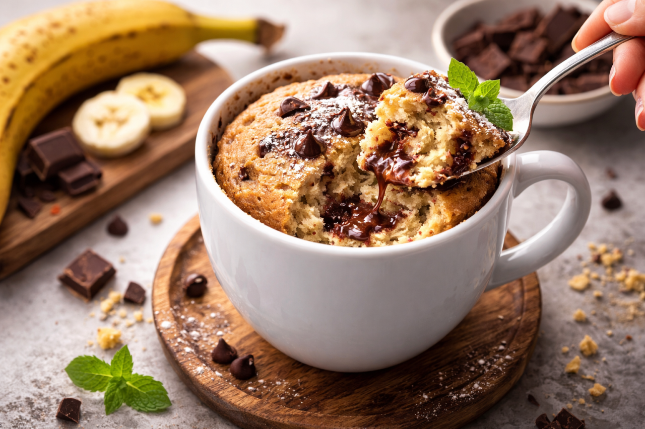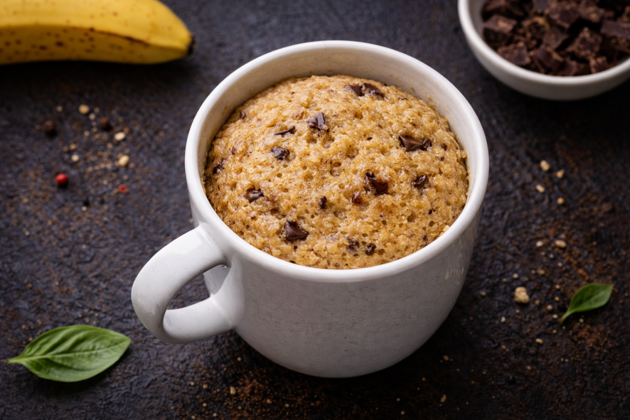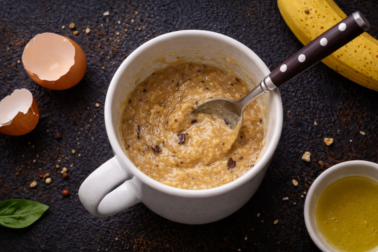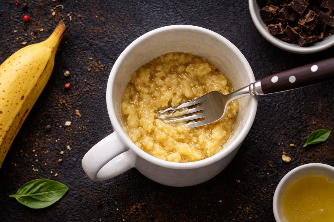Для вкуса нужен очень спелый банан. Чем темнее кожура, тем лучше аромат и сладость. Кружка подходит любая, но лучше объёмом 300–400 мл, чтобы тесто не убежало.