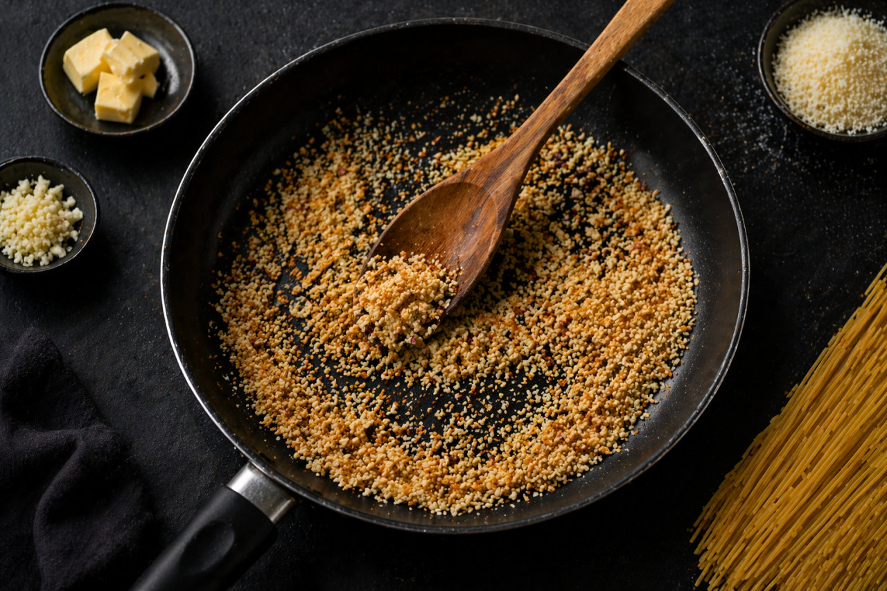 Разогрейте сухую сковороду на среднем огне. Всыпьте панировочные сухари и обжаривайте их 2-3 минуты, помешивая, пока они не станут золотистыми. Добавьте 1 столовую ложку оливкового масла и щепотку соли, перемешайте и сразу переложите в миску, чтобы они не подгорели.