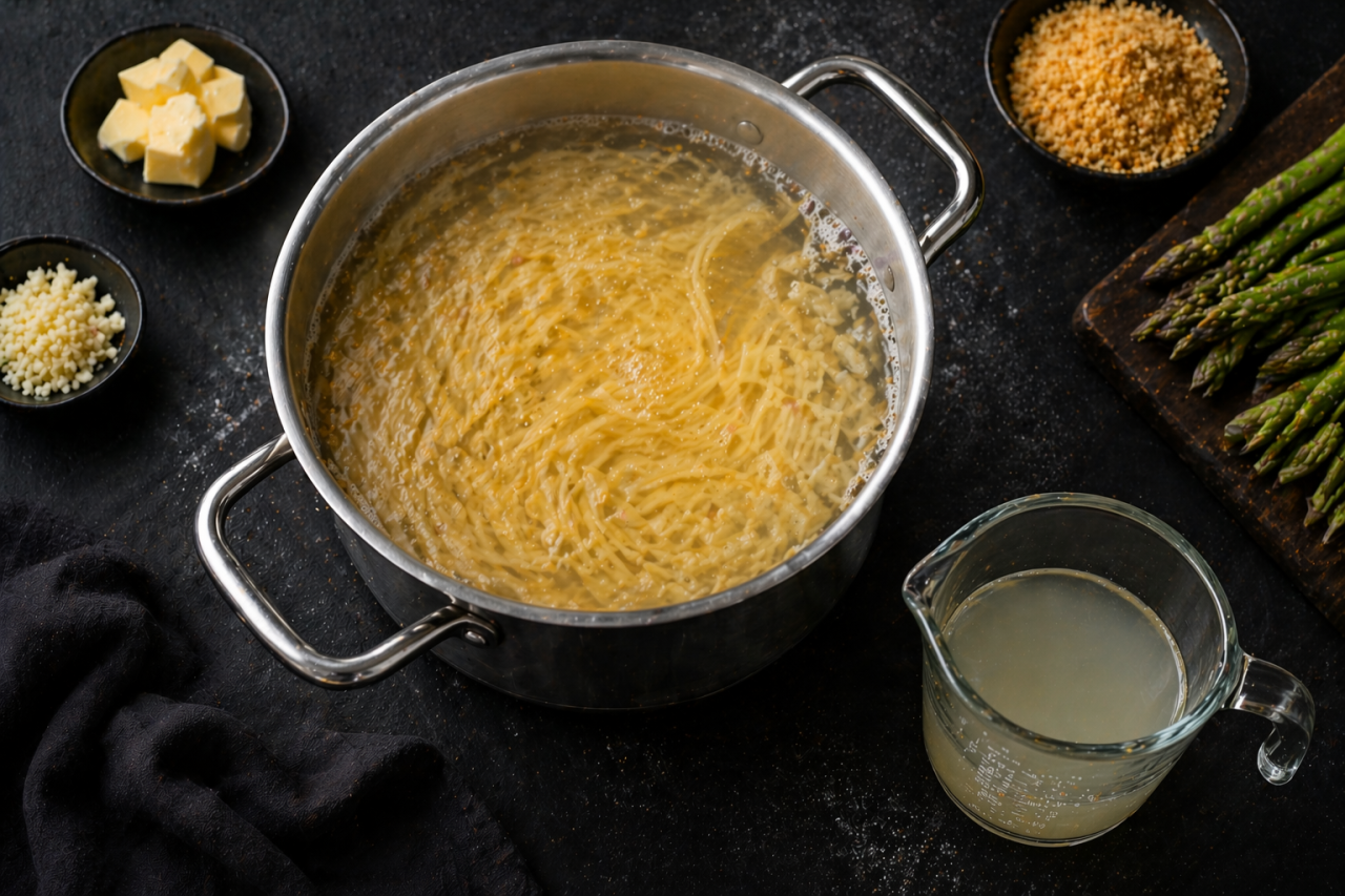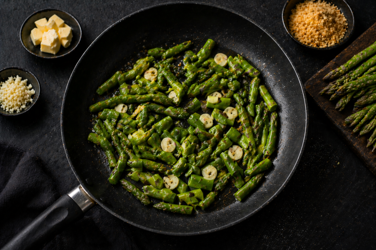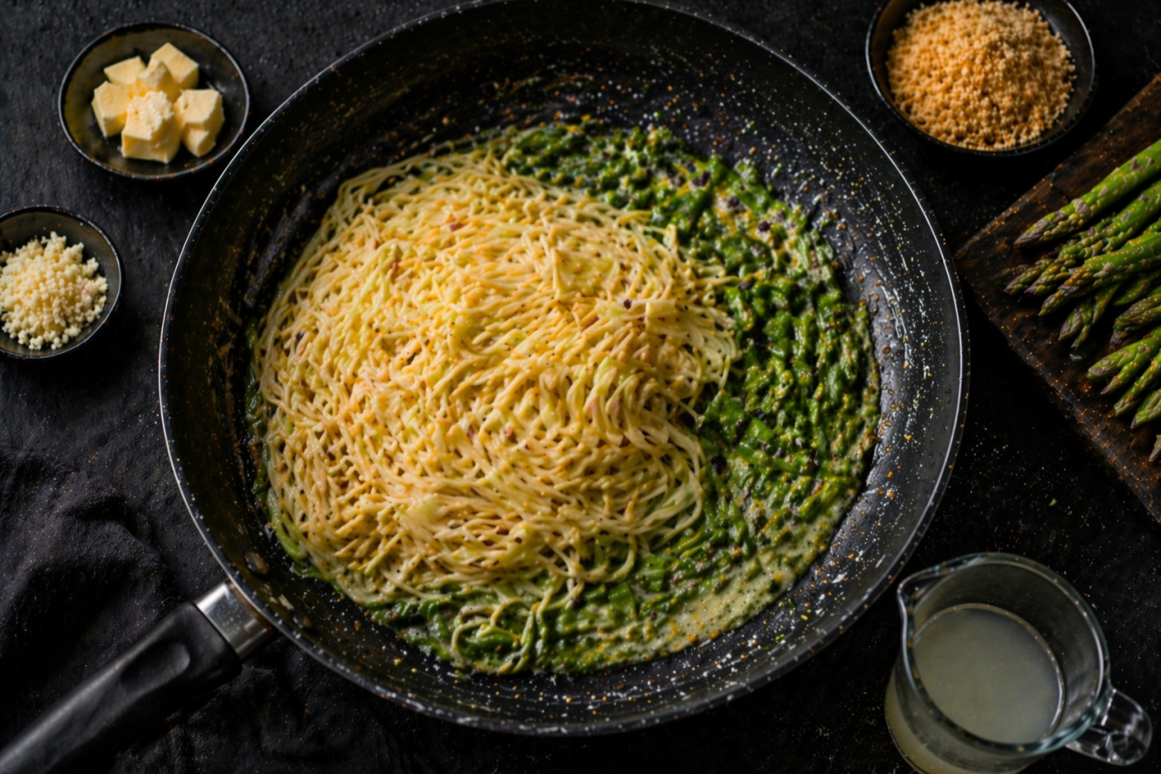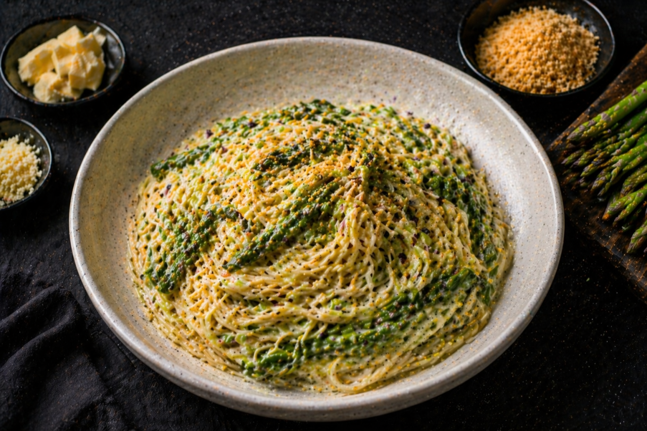 Когда появляется свежая спаржа, лучше всего готовить ее просто. Без тяжелых соусов и слишком сложных техник, чтобы не потерять главное, ее свежий, чуть сладковатый вкус. В этой пасте все работает именно на него: сливочное масло делает соус мягким, лимон добавляет яркость, пармезан дает насыщенность, а золотистые сухари собирают блюдо и добавляют приятный хруст.