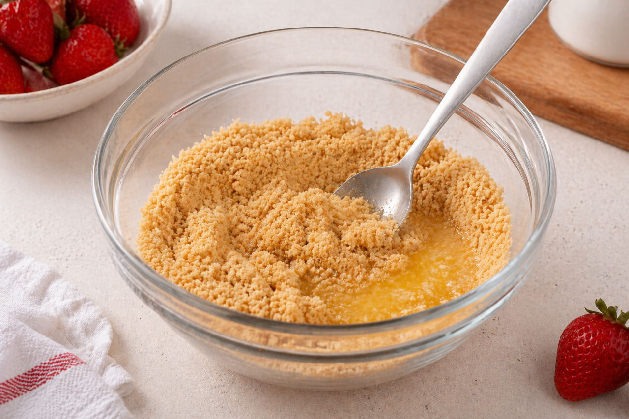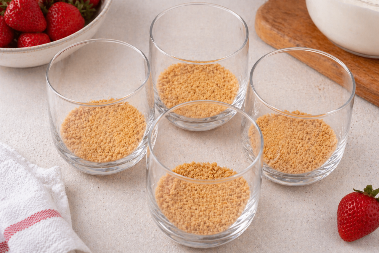 Важный момент: масла не должно быть слишком много. Основа должна держаться, но оставаться рассыпчатой. В стакане она не обязана стоять плотным коржом, как в классическом чизкейке. Здесь красивее и вкуснее работает именно нежная крошка.