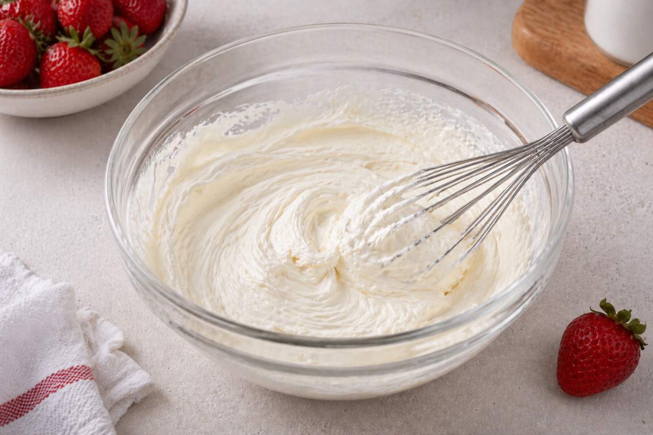 Крем должен получиться густым, мягким и спокойным по сладости. Не нужно делать его приторным, потому что клубника и печенье тоже дадут свой вкус. Если хочется более свежего оттенка, добавьте немного лимонной цедры. Она очень хорошо собирает весь десерт и делает его не тяжелым.