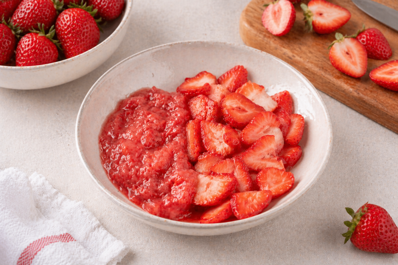 Если клубника сладкая, ничего добавлять не нужно. Если ягоды кисловатые, можно вмешать ложку сахара или меда и несколько капель лимонного сока. Получится быстрый ягодный соус, который красиво ляжет между слоями.