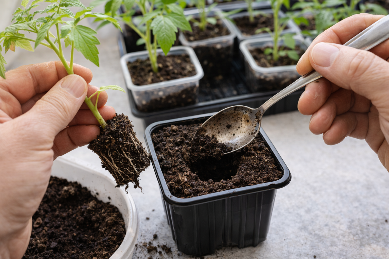 При пикировке новички хватают за стебель, мнут корни, заглубляют как попало, и потом удивляются, что всё стоит колом.