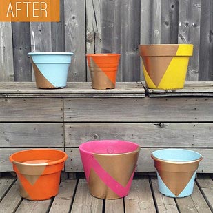 Обычные терракотовые горшки легко превратить в люксовый декор. Используйте малярный скотч, чтобы создать геометрические узоры, и баллончик с золотой или контрастной краской. Результат выглядит как из дорогого бутика.