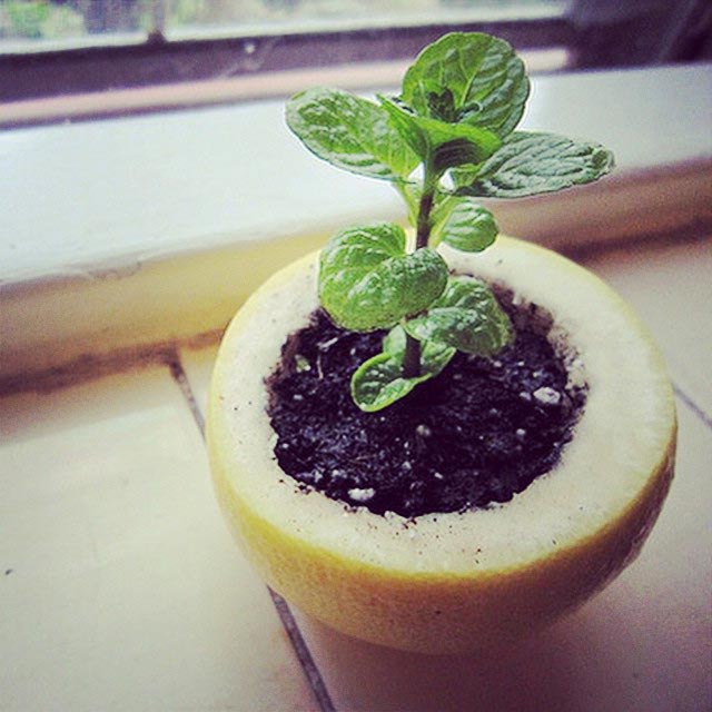 Половинки лимона или грейпфрута - идеальные биоразлагаемые горшочки для рассады. Сделайте дренажное отверстие внизу, насыпьте землю и сажайте. Когда придет время, растение можно закопать в грунт прямо в кожуре.