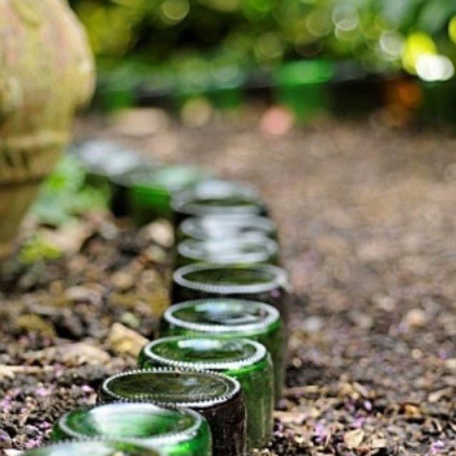 Пустые стеклянные бутылки, вкопанные горлышком вниз, создают стильный и аккуратный бордюр для клумб, который не боится ни дождя, ни солнца.