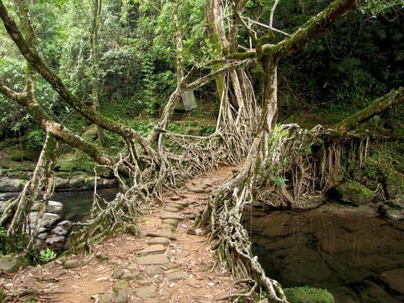 Народность кхаси, что живет в Черапунджи, издревле выращивает и прокладывает мосты из корней деревьев через реки. Со временем они становятся надежными средствами переправы.