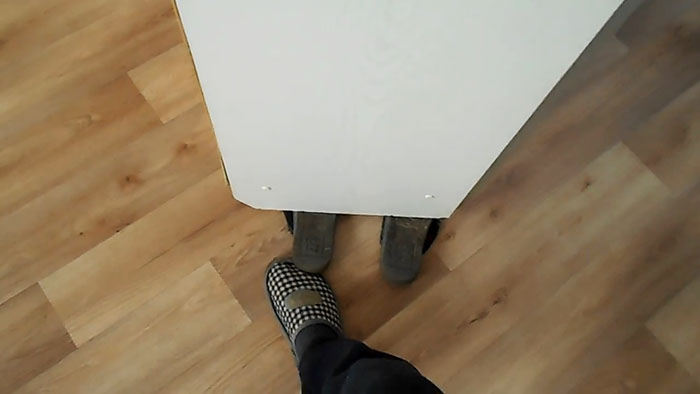 2. Переворачиваем тапочки подошвой вверх и аккуратно подсовываем по два с каждой стороны под шкаф, предварительно слегка приподняв его угол. Сделать это можно наклоном и помощью ноги - совсем не сложно.