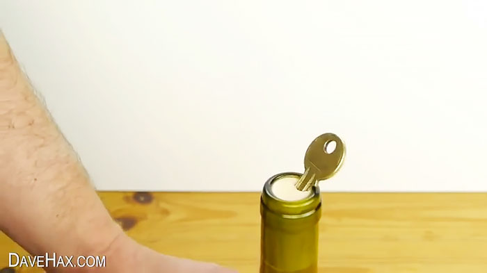 Возьмите ключ (лучше плоский, например, от входной двери) и вставьте его в пробку под небольшим углом. Надавите, чтобы ключ вошёл в пробку наискосок. Если давить тяжело, подложите под руку кусочек ткани - это добавит удобства и силы.