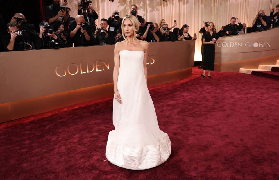 Эмили Блант выбрала белое платье с высоким воротником и накидкой, напоминающей пелерину, украшенную серебряными пуговицами. Формально - безупречно и аккуратно. Но для «Золотого глобуса» образ показался чрезмерно сдержанным и лишённым того самого праздничного гламура, которого ждут от красной дорожки.