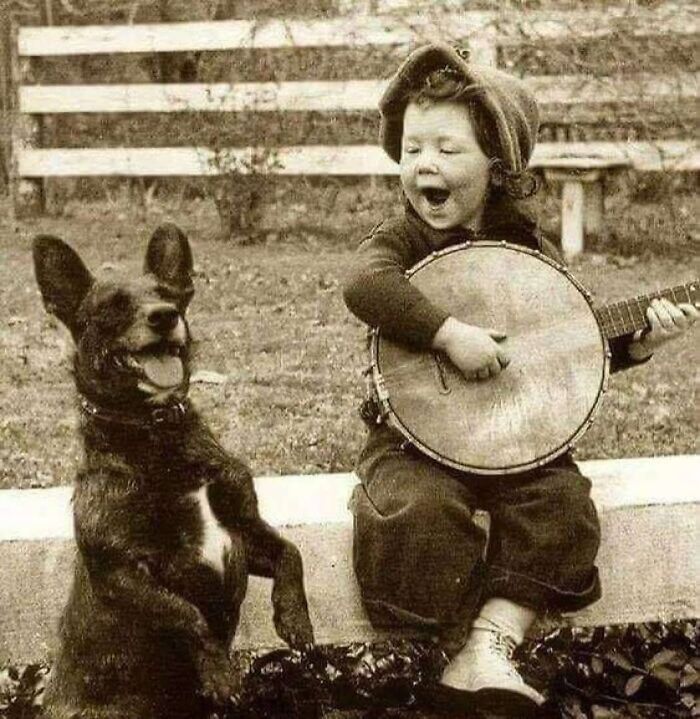Мальчик играет на банджо вместе со своим лучшим другом - собакой. Домашний концерт, в котором больше радости, чем во многих больших залах.