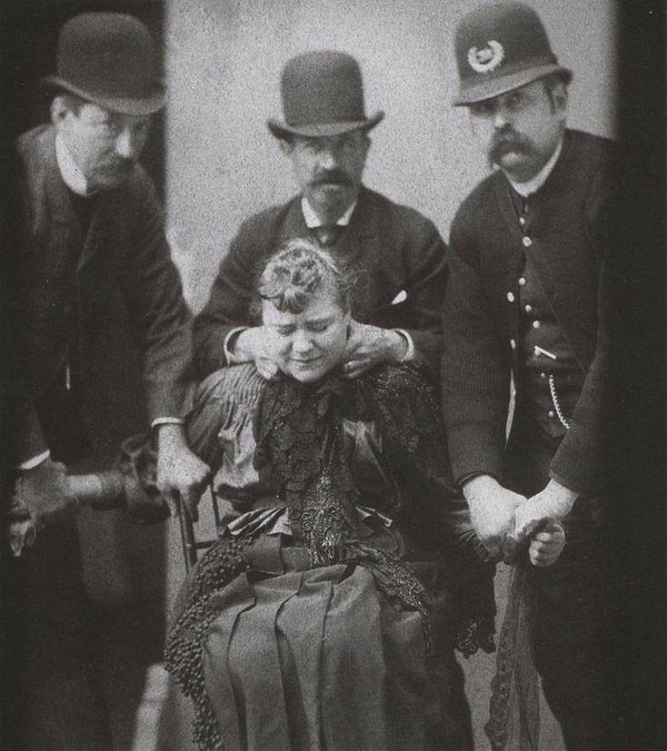 Женщину силой удерживают для съёмки полицейского портрета. Снимок из эпохи, когда фотография была не только документом, но и инструментом принуждения.