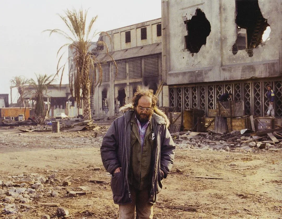 Стэнли Кубрик прогуливается по съемочной площадке фильма «Цельнометаллическая оболочка» в Бектоне, Восточный Лондон, 1986 год… Бектон был одним из мест в Англии, использованных в качестве декораций для разрушенного войной Хюэ, Южный Вьетнам, 1968 год.