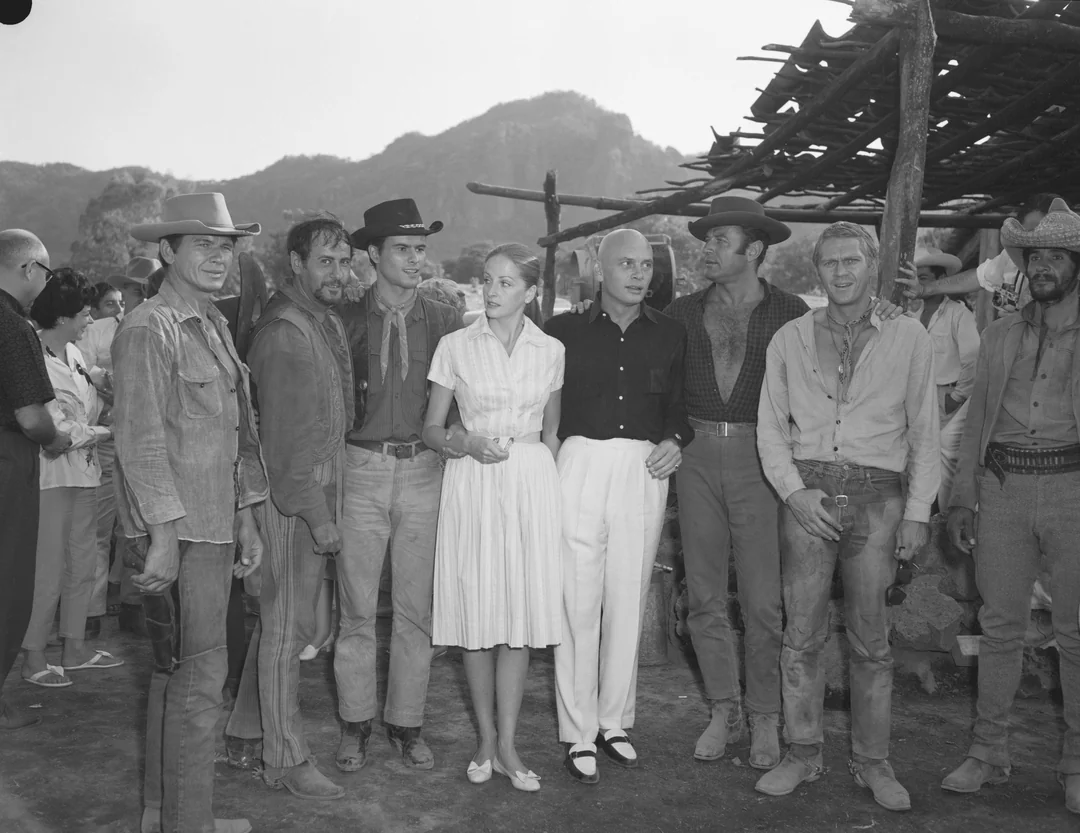 Праздник прямо на съёмочной площадке «Великолепной семерки»: Юл Бриннер празднует свадьбу с чилийской моделью Дорис Кляйнер. Слева направо: Чарльз Бронсон, Эли Уоллах, Хорст Бухгольц, Дорис и Юл Бриннер, Брэд Декстер и Стив Маккуин, 1960 год.