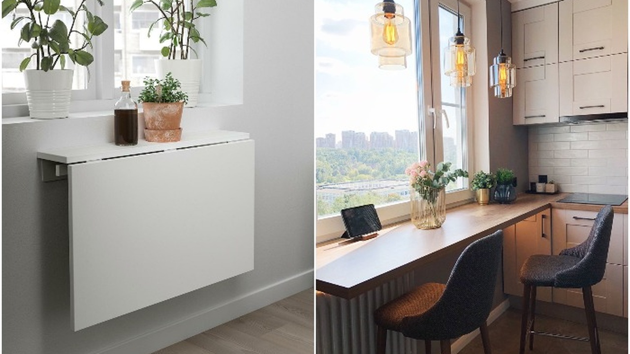Откидной настенный стол. Идеален для завтраков и короткой работы, после него остаётся пустая стена, а не мебельный остров.