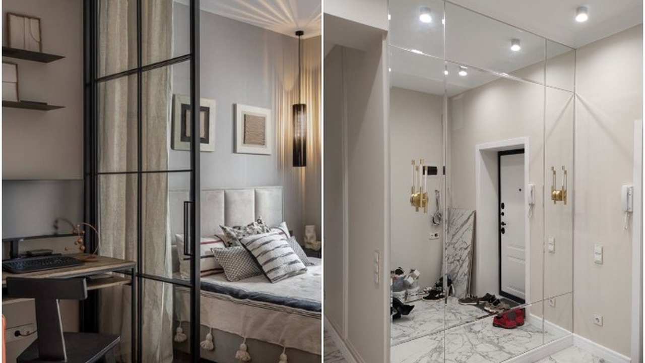 Зеркала крупного формата. Зеркальная стена, зеркальные двери шкафа, большое зеркало напротив окна. Мелкие зеркала тоже могут быть, но они редко дают тот самый эффект «просторнее».