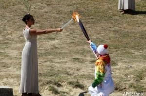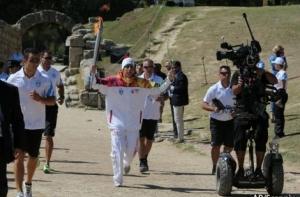 Зажиганию олимпийского огня с помощью параболического зеркала у руин храма Геры в Древней Олимпии предшествовала специальная церемония, которую провели одетые в белое оденяие актрисы, изображавшие жриц.