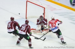 Динамовцам удалось отыграться через пять минут: первое звено навязало сопернику борьбу, Букартс вдоль борта отдал Щехуре, а канадец переадресовал пас на выкатывавшегося к ближней штанге Лауриса Дарзиньша, который в касание отправил шайбу по назначению - 1:1.