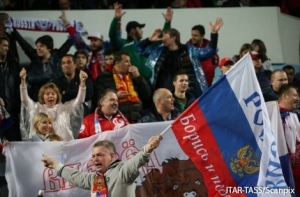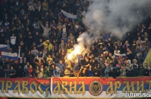 Перед матчем представители УЕФА провели совещание, на котором сообщили о запрете появления на трибунах символов организаций и стран, не принимающих участия в матче. Несмотря на это, на трибуне с болельщиками россиян по ходу встречи появлялись флаги Российской империи, Сербии и ДНР, сообщает CG-Fudbal. Из-за этого УЕФА может наказать и РФС.