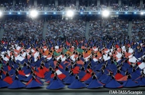 Церемонии открытия предшествовало импровизированное выступление знаменитого азербайджанского певца Алима Гашимова. А затем более тысячи девушек, находившихся на сооруженном в центре арены огромном круглом подиуме, на протяжении нескольких минут виртуозно и синхронно меняли расцветки своих платьев и грациозно перемещались по кругу, создавая различные национальные орнаменты, транслировавшиеся на два табло с мобильной телекамеры, расположенной на высоте нескольких десятков метров над стадионом, сообщает РИА Новости.