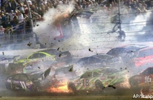 В Америке, на гонках серийных автомобилей NASCAR один из участников взорвался прямо в воздухе. Как сообщает Daily Mail, гонщик Аистин Диллон ехал со скоростью 200 километров в час, прежде чем врезался в автомобиль Денни Хамлина.