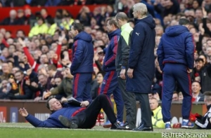 Главный тренер футбольного клуба «Манчестер Юнайтед» Луи ван Гал во время матча с «Арсеналом» демонстративно упал, чтобы изобразить симуляцию игрока соперников. Таким способом он пытался убедить рефери, что тот назначил ошибочный штрафной в сторону ворот МЮ.
