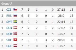 Таким образом, Латвия занимает в группе А предпоследнее 7-е место. В плей-офф из этой группы выходят Чехия, Россия, Швеция и Дания.