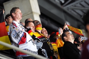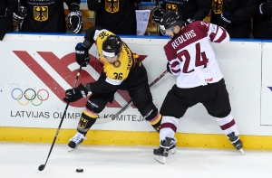 Матч начался с активной игры обеих команд, однако уже на второй минуте за применение силового приема против вратаря Кристера Гудлевскиса был дисквалифицирован игрок сборной Германии Янник Зейденберг. Однако латвийская команда не смогла воспользоваться численным преимуществом, а позже сама оказалась в меньшинстве, из-за чего были пропущены две шайбы.