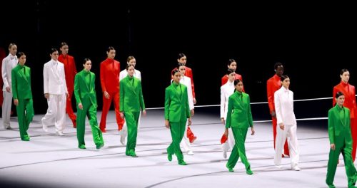 На стадионе «Сан-Сиро» почтили память культового дизайнера Джорджо Армани, умершего в возрасте 91 года прошлой осенью. Представители Италии прошли в костюмах модного дома Армани - в цветах итальянского флага.