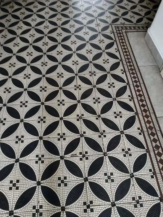 На первый взгляд кажется, что черно-белый пол имеет линейный квадратный рисунок с темными завитками, которые соединяются на каждом углу.