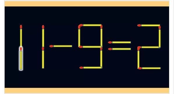 Чтобы исправить уравнение, превратите цифру 4 в 11, переложив одну спичку. В результате получится верное равенство: 11 - 9 = 2. Гениально и просто, правда? Одно движение - и уравнение стало правильным!