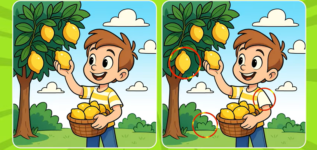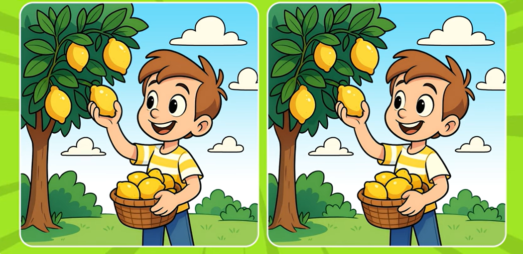 Вот он - солнечный день, мальчик собирает лимоны в саду, корзина уже почти полна, а рука тянется за очередным ярким плодом. На первый взгляд - две одинаковые картинки. Но если приглядеться повнимательнее, становится ясно: художник спрятал три отличия, и задача не такая уж простая!