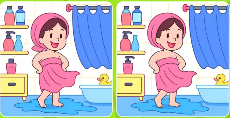 Посмотрите на эти две яркие, мультяшные картинки - на обеих изображена весёлая девочка после душа: на голове у неё розовое полотенце, она стоит на мокром полу, а рядом - ванна с резиновой уточкой. Всё кажется одинаковым… но это только на первый взгляд.