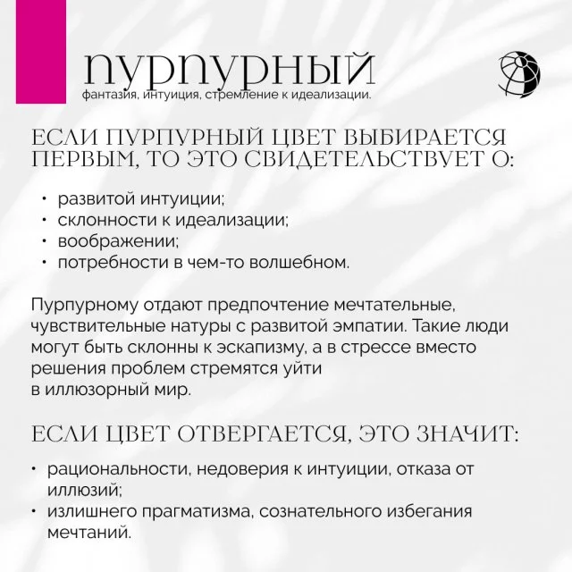 Тест Люшера, придуманный швейцарским психологом Максом Люшером в середине XX века, до сих пор остаётся одним из самых простых способов заглянуть в подсознание. Всё, что нужно, - это выбрать цвет, который в данный момент кажется наиболее привлекательным, а затем тот, что нравится меньше всего. Каждый оттенок в тесте несёт свою символику: синий говорит о спокойствии, красный - о страсти и энергии, а серый может намекать на усталость. Журнал «Вокруг Света» адаптировал классический вариант, сделав его доступным даже для тех, кто никогда не слышал о проективных методиках. Результаты теста помогают заметить, какие эмоции вы подавляете, а какие, наоборот, рвутся наружу без вашего ведома. Интересно, что один и тот же человек в разные дни может выбрать совершенно разные цвета - и это нормально, ведь настроение меняется. Тест не ставит диагнозов, но подсвечивает внутренние конфликты, которые иногда мешают жить полной жизнью. Многие удивляются, насколько точно цветовой выбор отражает текущие переживания: стресс, радость или скрытую тревогу. Попробовать можно прямо сейчас - достаточно закрыть глаза, представить палитру и послушать свой внутренний голос. После теста часто возникает желание записать мысли, потому что цвета словно вытаскивают на поверхность то, о чём давно хотелось поговорить.