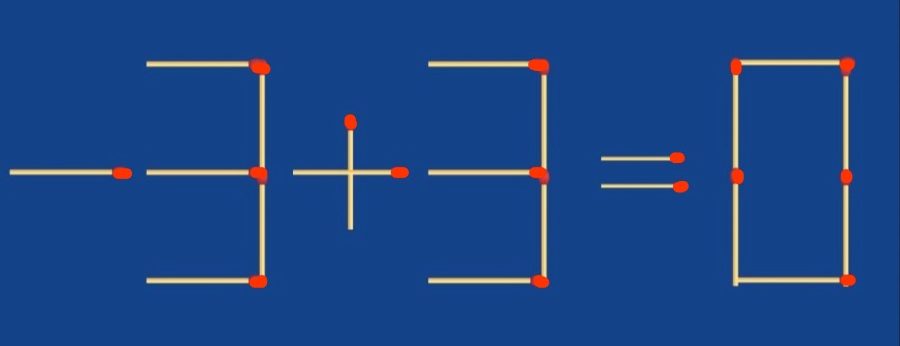А теперь держитесь: есть ещё третий вариант, который заставляет всех ахнуть. Берём правую «8», убираем левую вертикальную спичку - и вуаля, перед нами ноль. Оставшуюся спичку кладём перед первой тройкой как минус. Итог: –3 + 3 = 0. Логично, изящно и немного дерзко - именно так мы любим.
