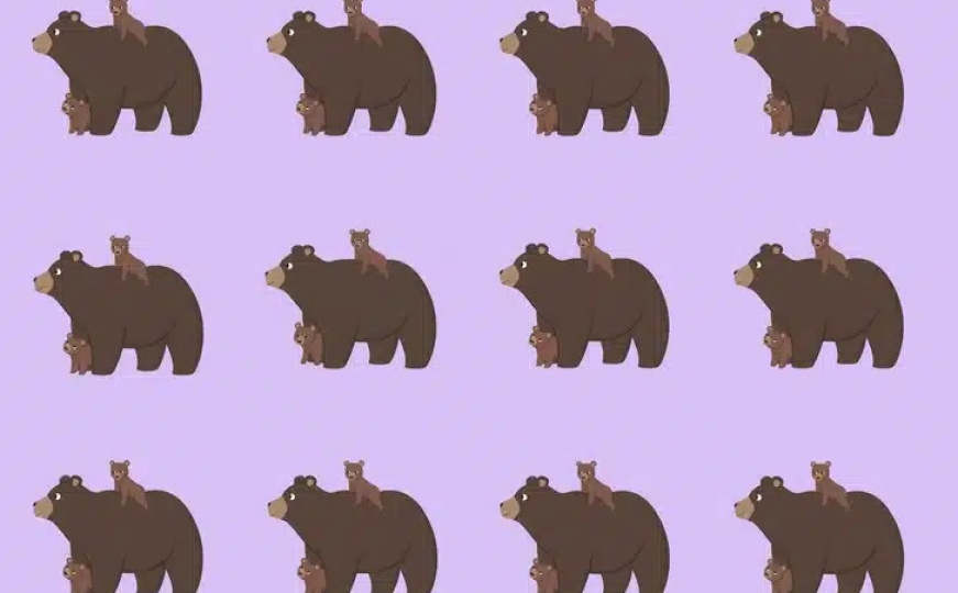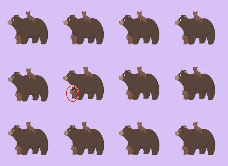 Перед вами ряд очаровательных медведиц с их малышами. На первый взгляд все они выглядят одинаково, но только одна медвежья семья отличается от остальных. Сможете ли вы найти её?