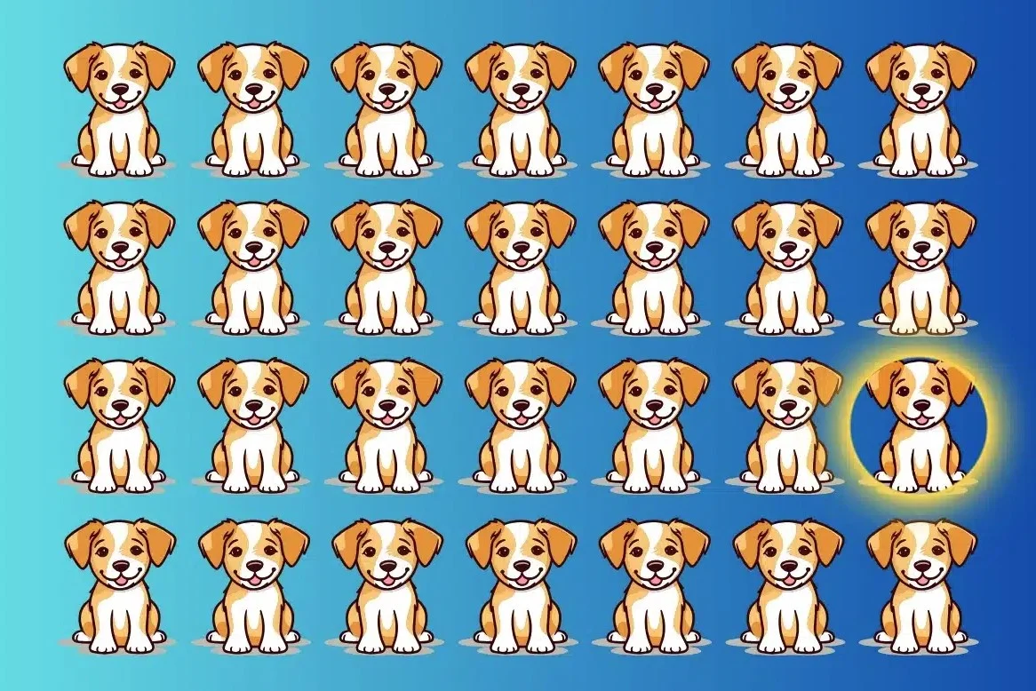 На картинке изображена собака, которая отличается от других. Отличие едва заметное, но оно есть - и именно это делает эту головоломку интересной. Внимательно посмотрите: уши, хвост, лапы, мордочка, узор на шерсти - всё может быть подсказкой. Сколько времени вам понадобится, чтобы найти другую собаку?