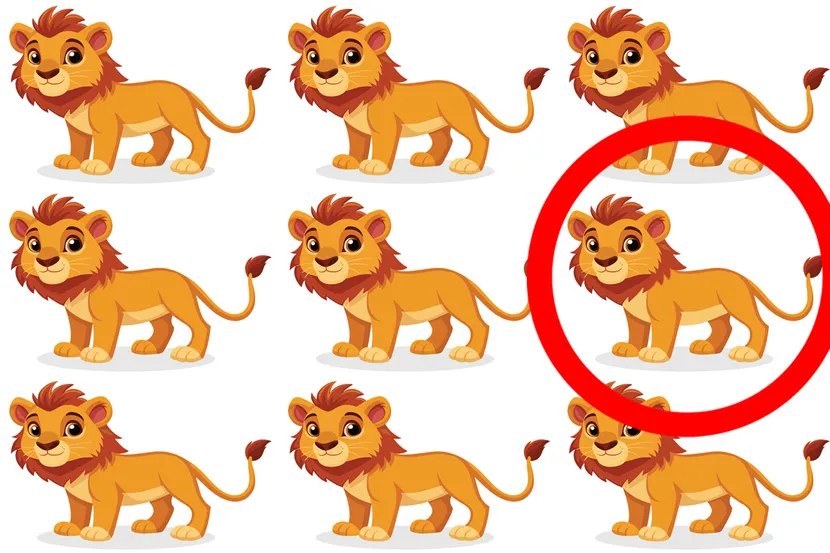 Внимательно посмотрите на изображение и постарайтесь как можно быстрее найти льва, который отличается от остальных.