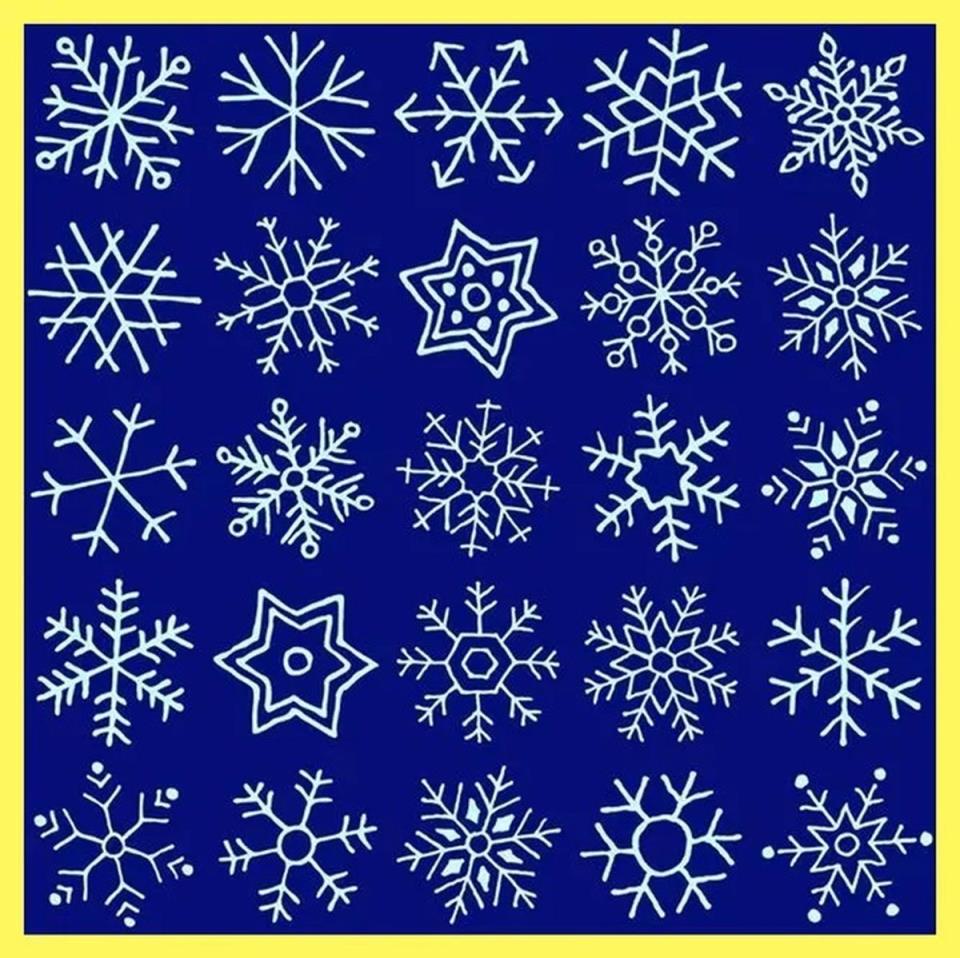 Перед вами визуальная головоломка на внимательность: среди десятков снежинок спряталась пара абсолютно одинаковых. На всё - не больше 15 секунд.