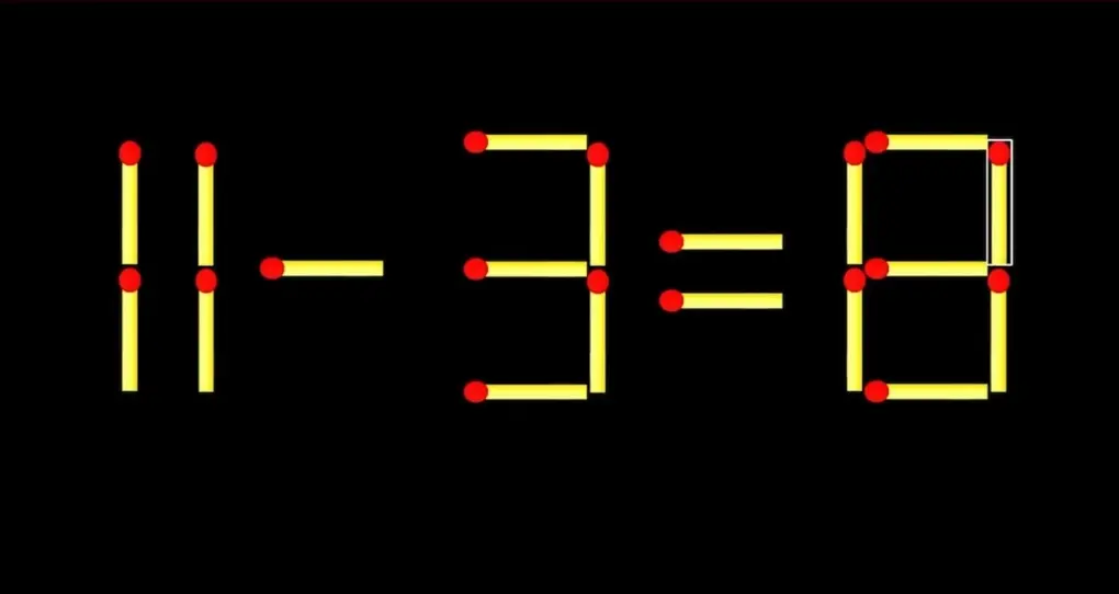 Секрет в двойной трансформации! Заберите одну спичку у цифры «9» (превратив её в «3») и добавьте её к цифре «6» (сделав из неё «8»). Итог: Математическая магия превращает абсурд в идеальное равенство: 11 – 3 = 8.