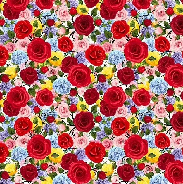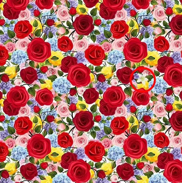 На первый взгляд изображение кажется обычным цветочным узором: десятки ярко-красных роз, нежные розовые бутоны, синие и жёлтые цветы переплетаются в пестром саду. Но среди всей этой красоты спрятался один особенный цветок.