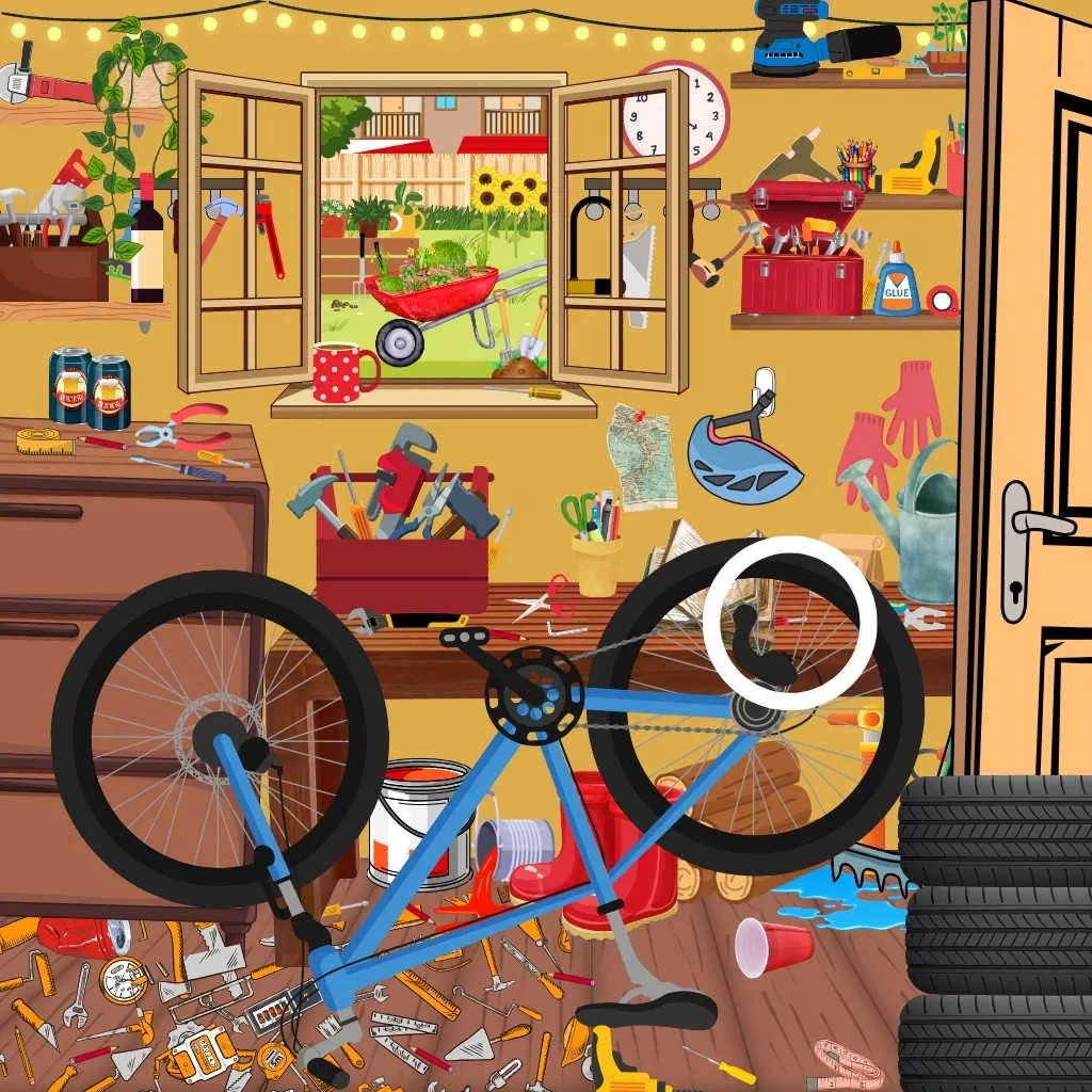 На изображении показана загруженная велосипедная мастерская: повсюду лежат инструменты, шлемы, перчатки, банки с краской, детали и даже целый велосипед на стойке. В этом хаосе спрятана одна красная отвёртка.