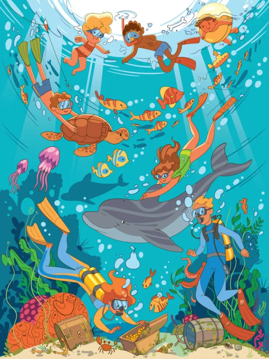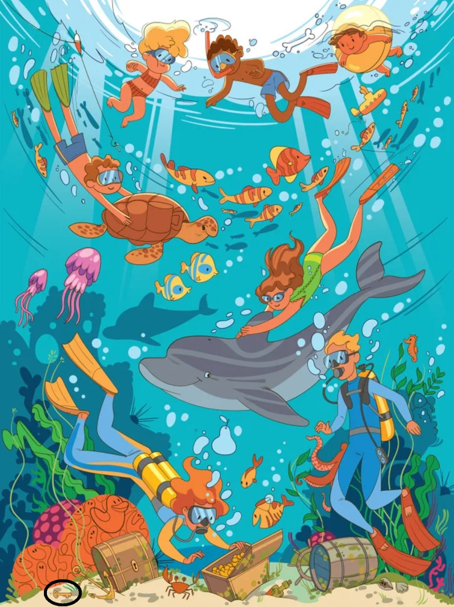 Перед вами яркая сцена под водой: дайверы, рыбы, черепаха, сундуки с сокровищами… Всё выглядит как обычная иллюстрация. Но на самом деле это визуальный тест, который проверяет вашу внимательность и способность замечать детали.
