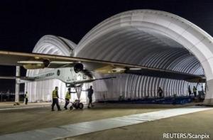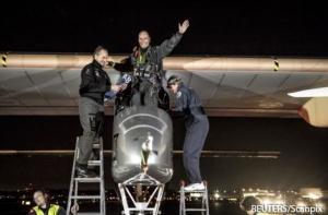 Самолет Solar Impulse («Солнечный импульс»), сконструированный в Швейцарии, представляет из себя планер с размахом крыльев в 63,4 метра и массой в 1588 килограммов. Он приводится в движение четырьмя моторами мощностью 10 лошадиных сил каждый. Они питаются от 400-килограммового литиевого аккумулятора, который заряжается от размещенных на крыльях фотоэлементов. Создатели самолета Андре Боршберг и Бертран Пиккар уже планируют следующий этап: в 2015 году «Импульс» начнет кругосветное путешествие.