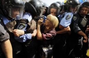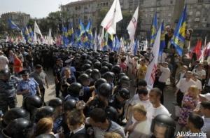 В знак протеста против заседаний городского парламента, у депутатов которого истекли полномочия 2 июня, оппозиционеры сегодня, 11 июля, собрались вокруг здания Киевсовета. Их начали оттеснять организованные ряды правоохранителей. Митингующие протестовали, скандировали «Банду геть!», но были вынуждены отойти.