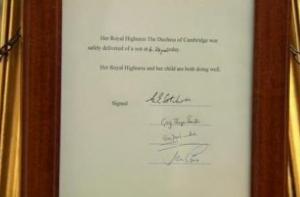 Как только первенец пары появился на свет, уведомление об этом было вывешено на деревянной доске, украшенной позолотой, на воротах Букингемского дворца.